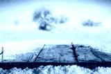 Winter and snow background with empty wooden table top and copy space and snow covered landscape in distance.