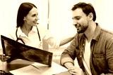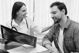 Pulmonology concept. Female doctor radiologist explaining examining at lungs radiograph x-ray film of man male patient diagnosis, treatment, showing x-ray image with lungs rib cage bones at hospital.