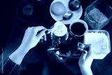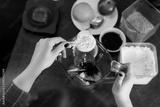 Close up top view woman adding plant based pea protein powder during making smoothie on the kitchen. Superfood supplement. Healthy nutritional vegan diet. Healthy dieting eating, weight loss program.