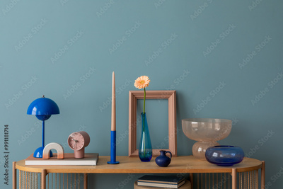 Elegant display with modern decor including a blue lamp, minimalist vases, and sculptural glassware, creating a serene and sophisticated tabletop arrangement.