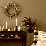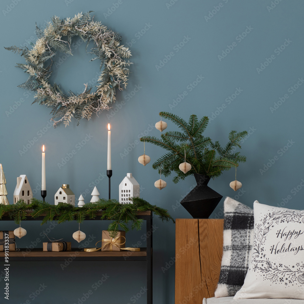 Cozy and stylish christmas living room interior with, modular sofa, wooden console with spruce, balls, candlestick with candle, christmas wreath, gifts, decoration. Santa claus is coming. Template.