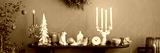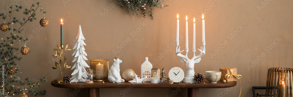 Elegant composition of christmas living room interior with wooden console, stylish wreath, deer candlestick with candle, clock, christmas tree, gifts and personal accessories. Home decor. Template.