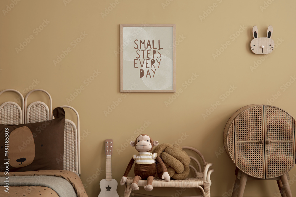 Aesthetic composition of child room interior with mock up poster frame, yellow wall, plush toys, monkey, rattan sideboard, guitar, brown bedding and personal accessories. Home decor. Template.
