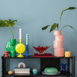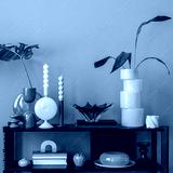 Colorful composition on blue wall with black shelf, design accessories, and decorations vases with leaf, candels and copy space. Home decor. Template.