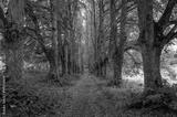 Tranquil tree-lined pathway through lush greenery during autumn in a serene forest