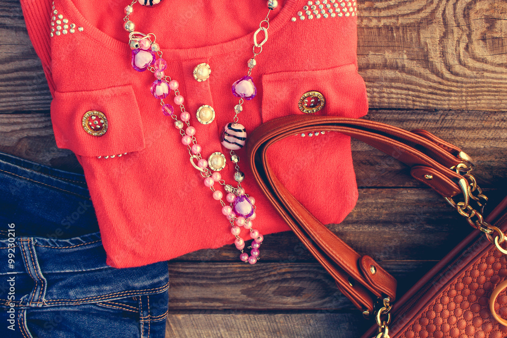 Women's clothing and accessories: sweater, jeans, handbag, beads on wooden background. Toned image.