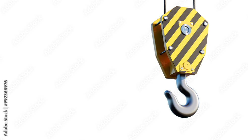Hook from industrial lifting equipment. Crane hook isolated on white. Equipment for carrying heavy loads. Crane hook with bright yellow stripes. Engineering equipment. Copy space. 3d image