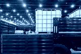 Transportation IBC tanks. Plastic barrel in back truck. IBC with fuel is ready for delivery. Open truck body with plastic containers for liquid. IBC in metal sheathing. Logistics of chemical products