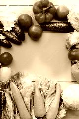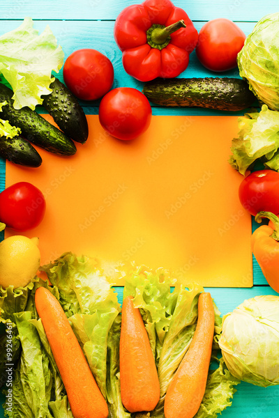 Frame of vegetables with recipe paper on vertical wooden background. Top view