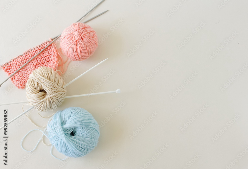 Knitting cloth and knitting needles pastel colors on light beige background top view with copy space. Handmade hobbie concept.