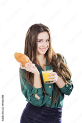 Young woman with glass of juice and croissant