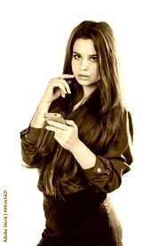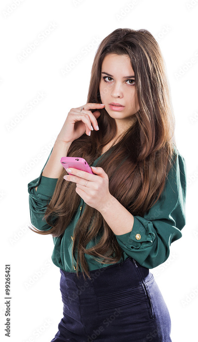 beautiful young girl on a white background is a pink cell phone telefonom.Govorit. Smiles. Surprised.