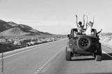 Rear View Of Friends On Road Trip Driving In Convertible Car