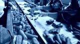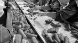 Workers examining and sorting fresh carrots on a conveyor system in a processing facility during daylight hours