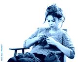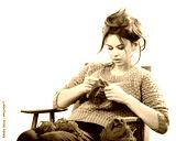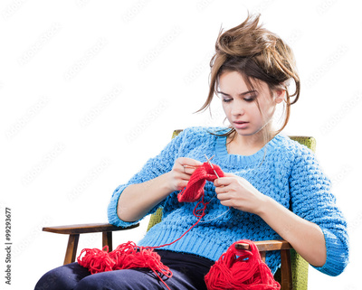 tortured young girl in a sweater sits on a chair with a red ball of yarn and knitting a scarf and Spitz. Tired. White background.