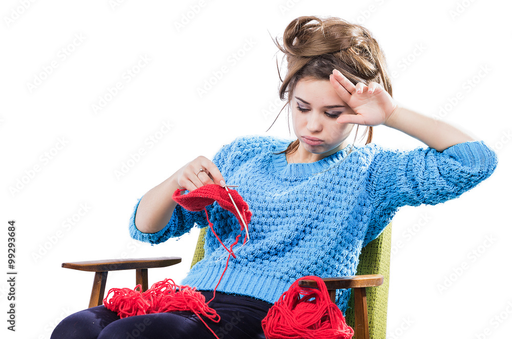 tortured young girl in a sweater sits on a chair with a red ball of yarn and knitting a scarf and Spitz. Tired. White background.