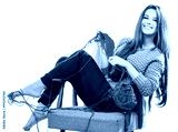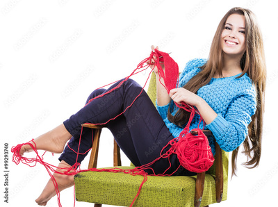 young girl in a blue sweater sits on a chair with a red ball of yarn and knitting a scarf and Spitz. Smiles. White background.