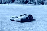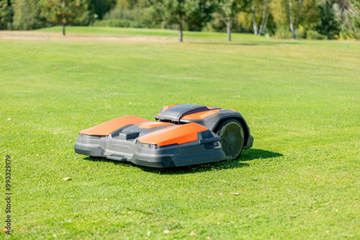 A robotic Auto mower cuts the well manicured lawn.