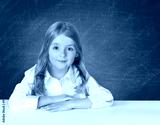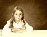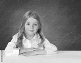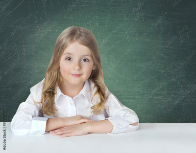 Сhild school girl in white shirt sitting at the table on blackb