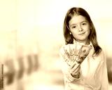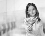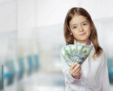 Child girl holding money in hands financial background.
