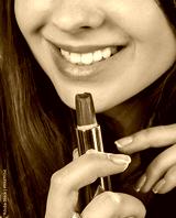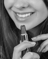Close up of an attractive girl she opened her mouth and put them red lipstick. Smiles. Brown eyes.