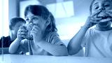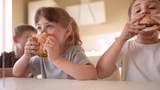children eat burgers. fast food burger. a group of small fun children in the kitchen greedily eat fast food burgers. big family small kids having breakfast in the morning in the kitchen eating burger