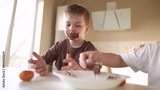 baby boy and girl eat chocolate. dirty little baby kids in the kitchen eating chocolate in the morning. happy family eating sweets kid dream lifestyle concept. baby dirty face eating chocolate cocoa