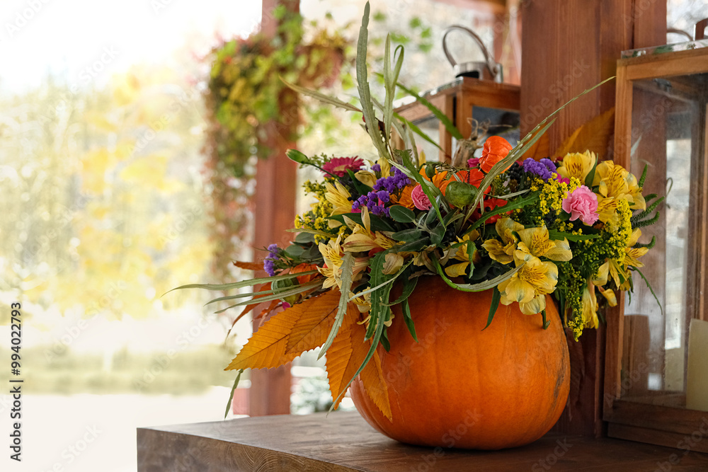 autumn background. beautiful floral bouquet in pumpkin on garden table. decorative composition with flowers in pumpkin vase for autumn season, thanksgiving, halloween. fall decor.