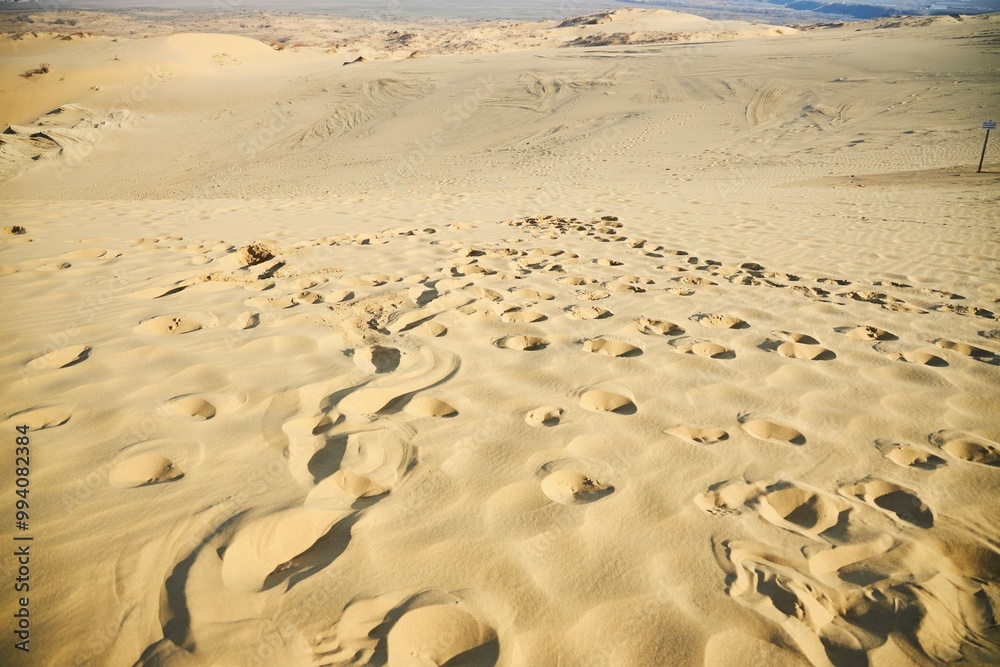 A sandy beach with footprints in the sand.