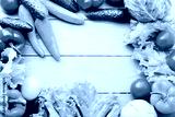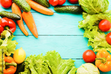 Macro vegetables with copy space on blue wooden table. Top view and selective focus