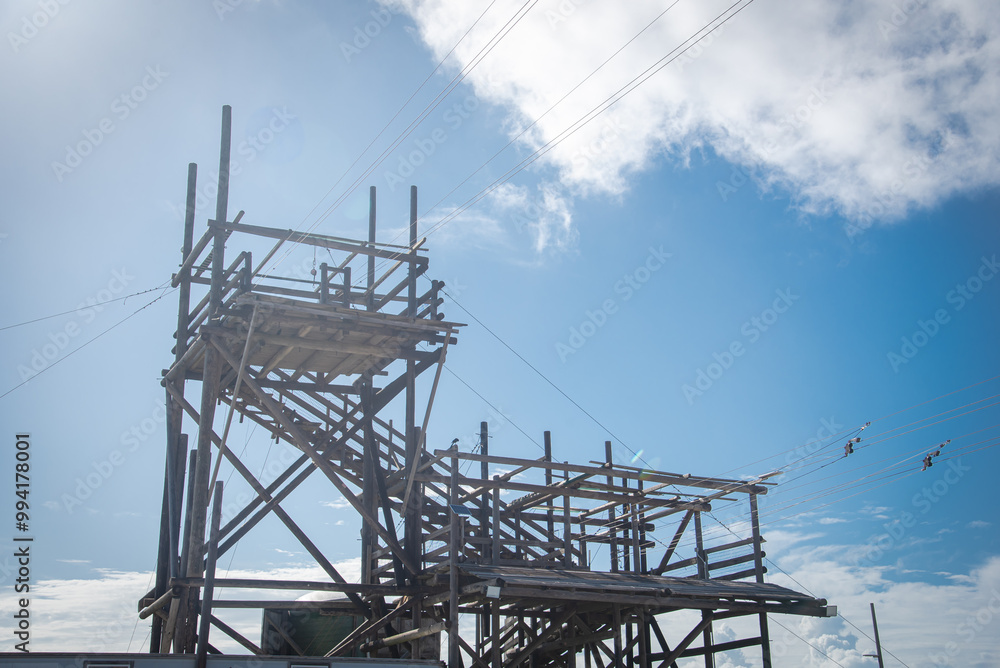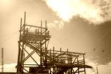 Tall tower observation structures with stairs for zip-lines experience at outdoor adventure park in South Padre Island, TX, take-off and landing zip-line circuit, zipping recreational activities