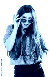 young woman with dark hair wearing a blue knitted sweater standing on a white background with the isolation points. Keep glasses.