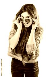 young woman with dark hair wearing a blue knitted sweater standing on a white background with the isolation points. Keep glasses.