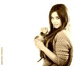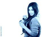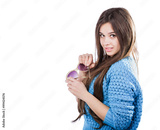young woman with dark hair wearing a blue knitted sweater standing on a white background with the isolation points. Keep glasses.