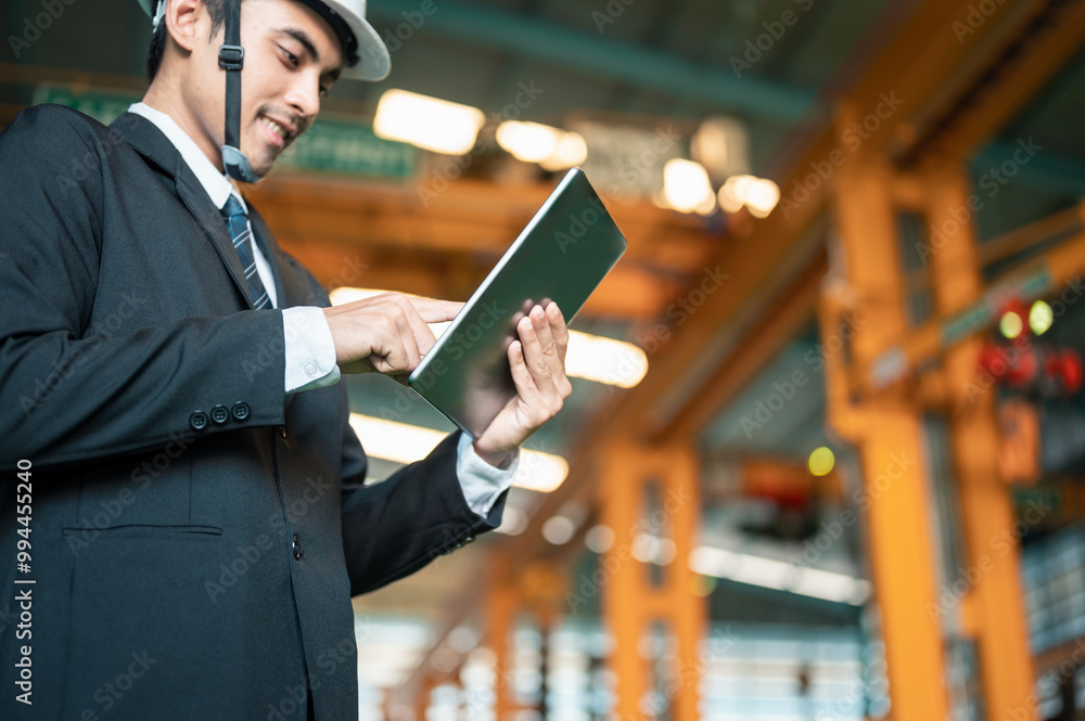 engineer, technician, architect, checking, distribution, manufacturing, hard hat, construction, safety, machinery. A man in a suit is using a tablet while standing in a large industrial building.