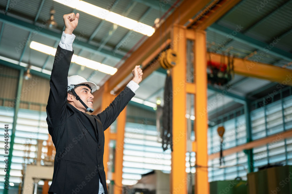 mechanic, maintenance, manufacture, industrial, steel, machine, hardhat, factory, engineer, machinery. A man in a black suit is celebrating in a factory. He is holding his hands up in the air.