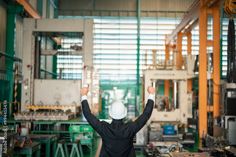 security, engineer, safety, heavy, manufacture, machinery, industrial, cooperation, hardhat, inspector. A man in a hard hat, is giving a thumbs up in a factory. Concept of accomplishment.