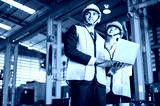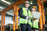 warehouse, headwear, manufacture, industrial, factory, foreman, forklift, hard hat, helmet, hardhat. Two people wearing safety gear and holding a laptop. They are looking at something on the laptop.