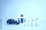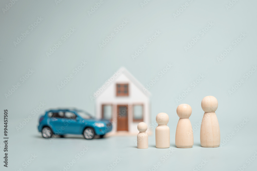 financial, finance, investment, income, broker, deal, estate, insurance, mortgage, plan. A blue car is parked in front of a white house. A family of four is standing in front of the house.