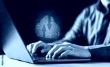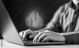 software, tech, security, analysis, typing, future, keyboard, system, network, innovation. A man is typing on a laptop with a cloud symbol on the screen. Concept of technology and the internet.