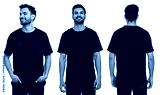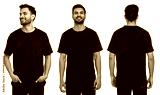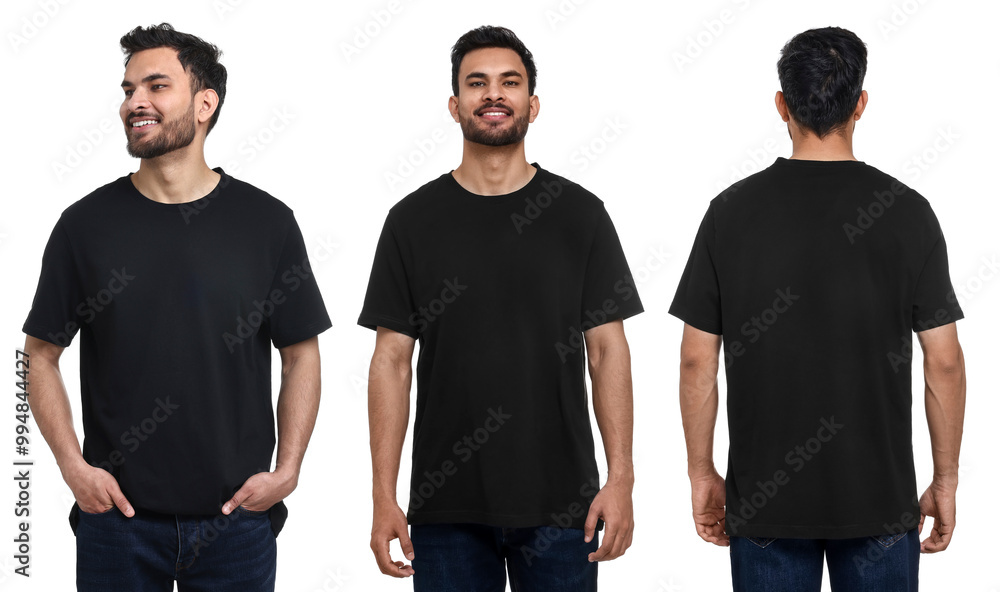Handsome man in black t-shirt on white background, collage of photos