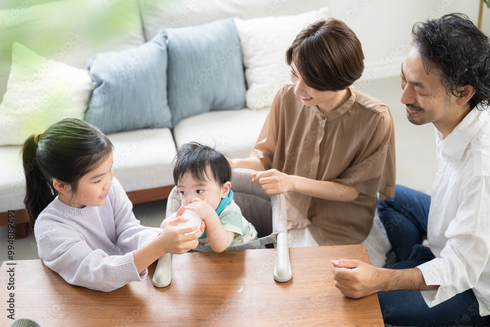 笑顔で赤ちゃんにミルクをあげる姉と両親 仲良し家族 俯瞰