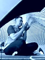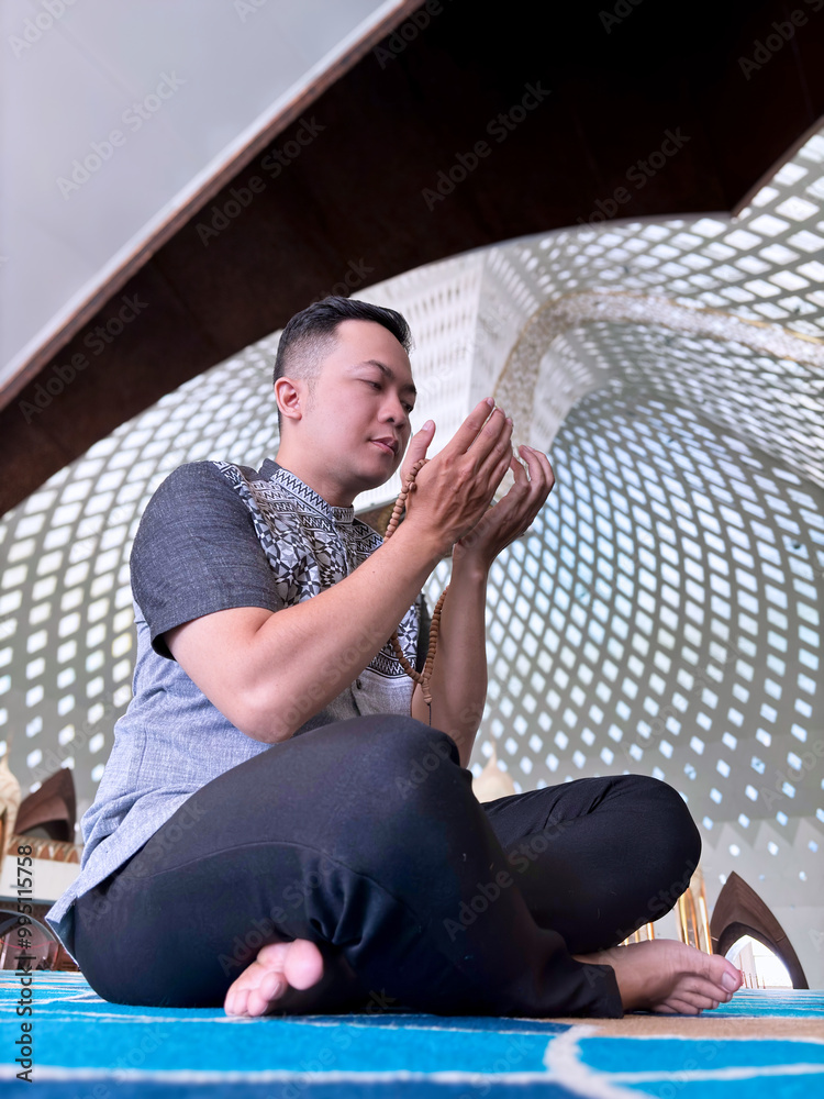 A Muslim man praying in a mosque in a seated position while raising both hands