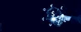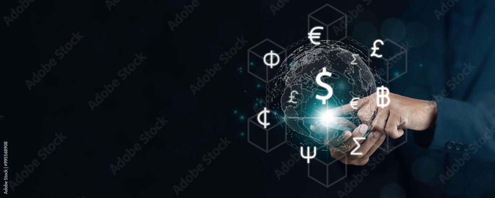 Business man doing financial transaction currency exchange, foreign currency, international money transfer, banking payment with copy space. Currency exchange with blockchain technology concept.
