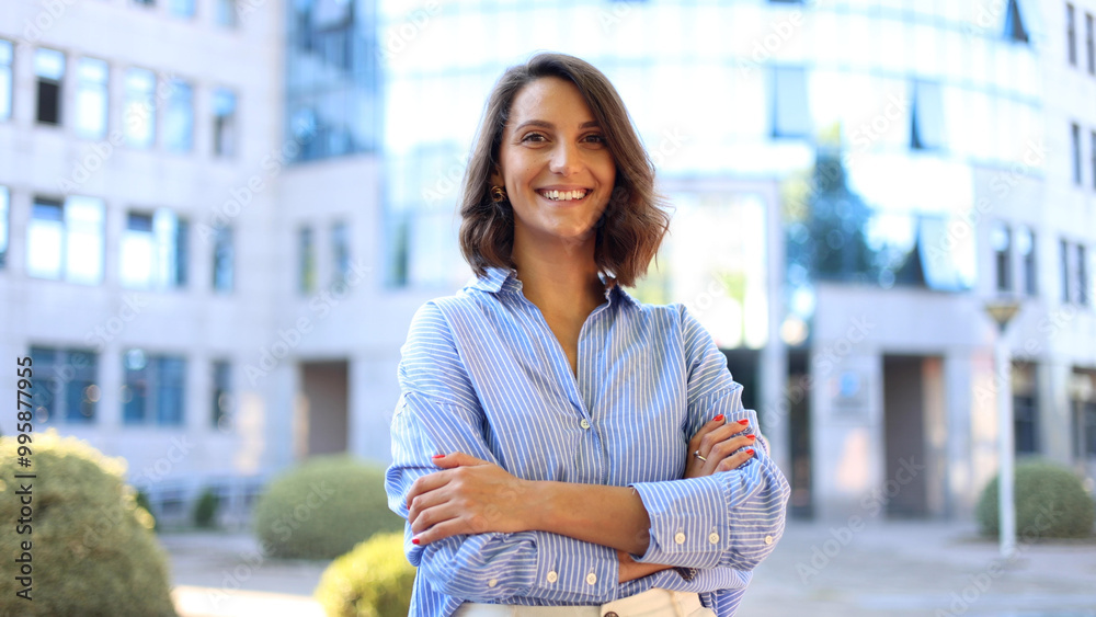 Cheerful young career woman standing on the sidewalk and smiling confidently