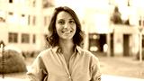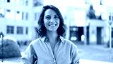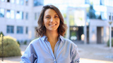Cheerful young career woman standing on the sidewalk and smiling confidently