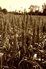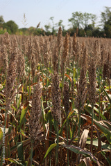Dry brown Sorghum or millet plants in the field ready to harvest against blue sky. Sorghum agricultural cultivation in northern