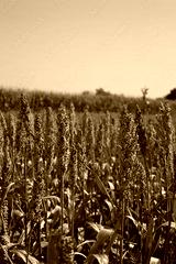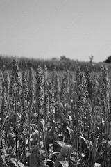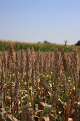 Dry brown Sorghum or millet plants in the field ready to harvest against blue sky. Sorghum agricultural cultivation in northern