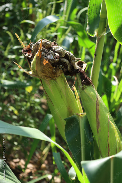 Corn smut. Ustilago maydis disease on corn plant in the field. Fungal disease on a corn cob