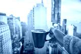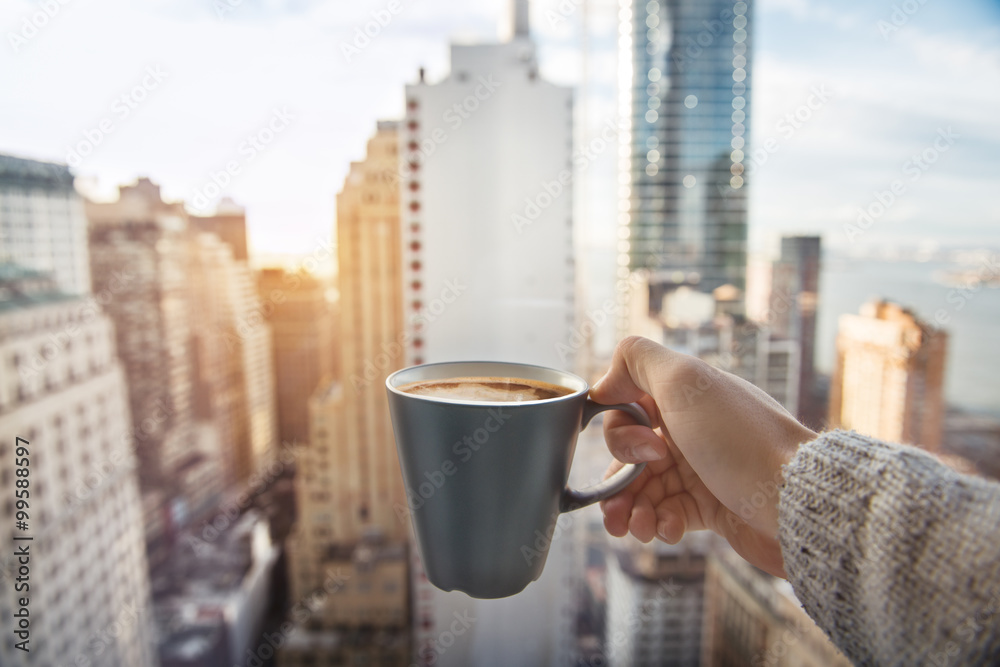 Man holding coffee cup in luxury penthouse apartments with view to New York City Manhattan downtown at the morning